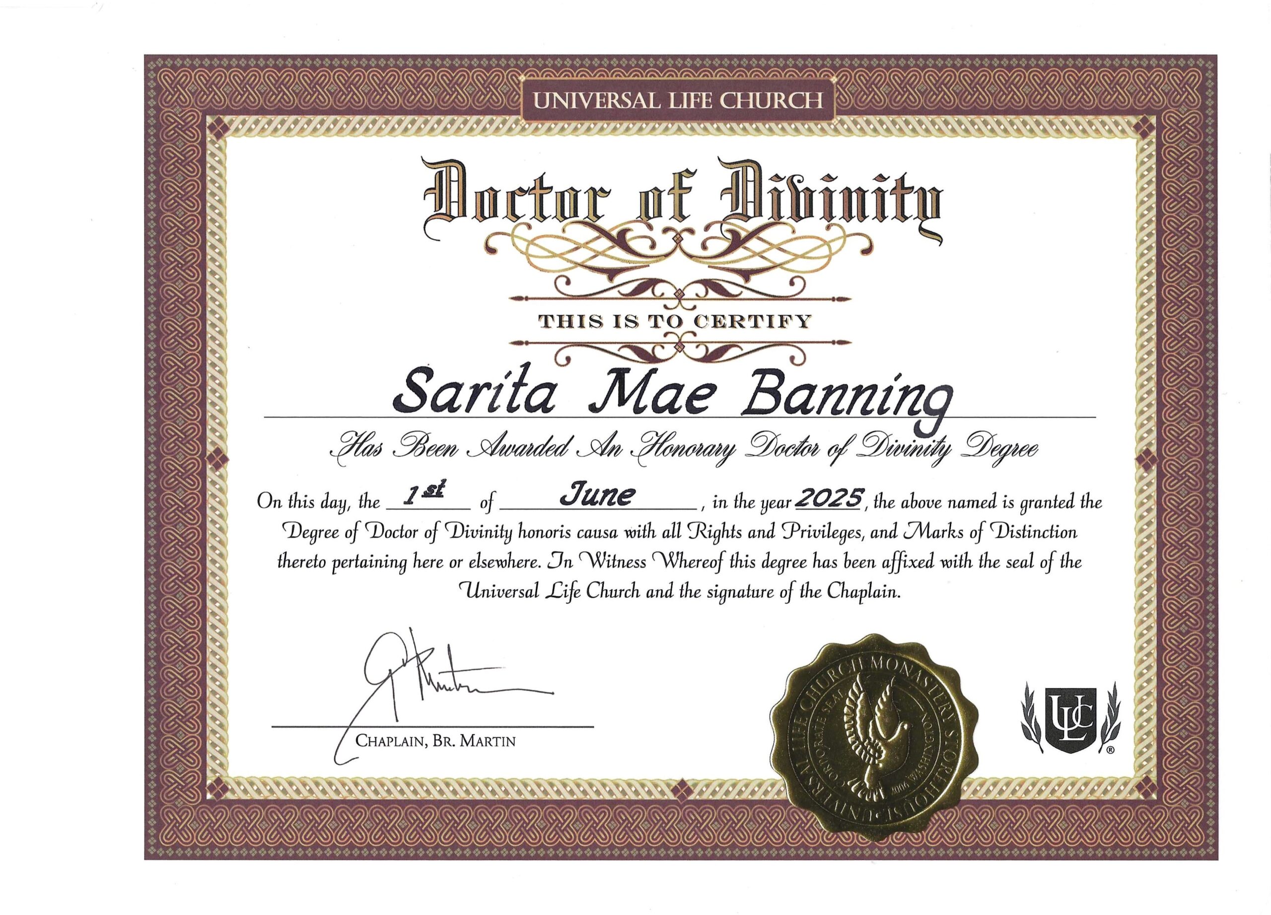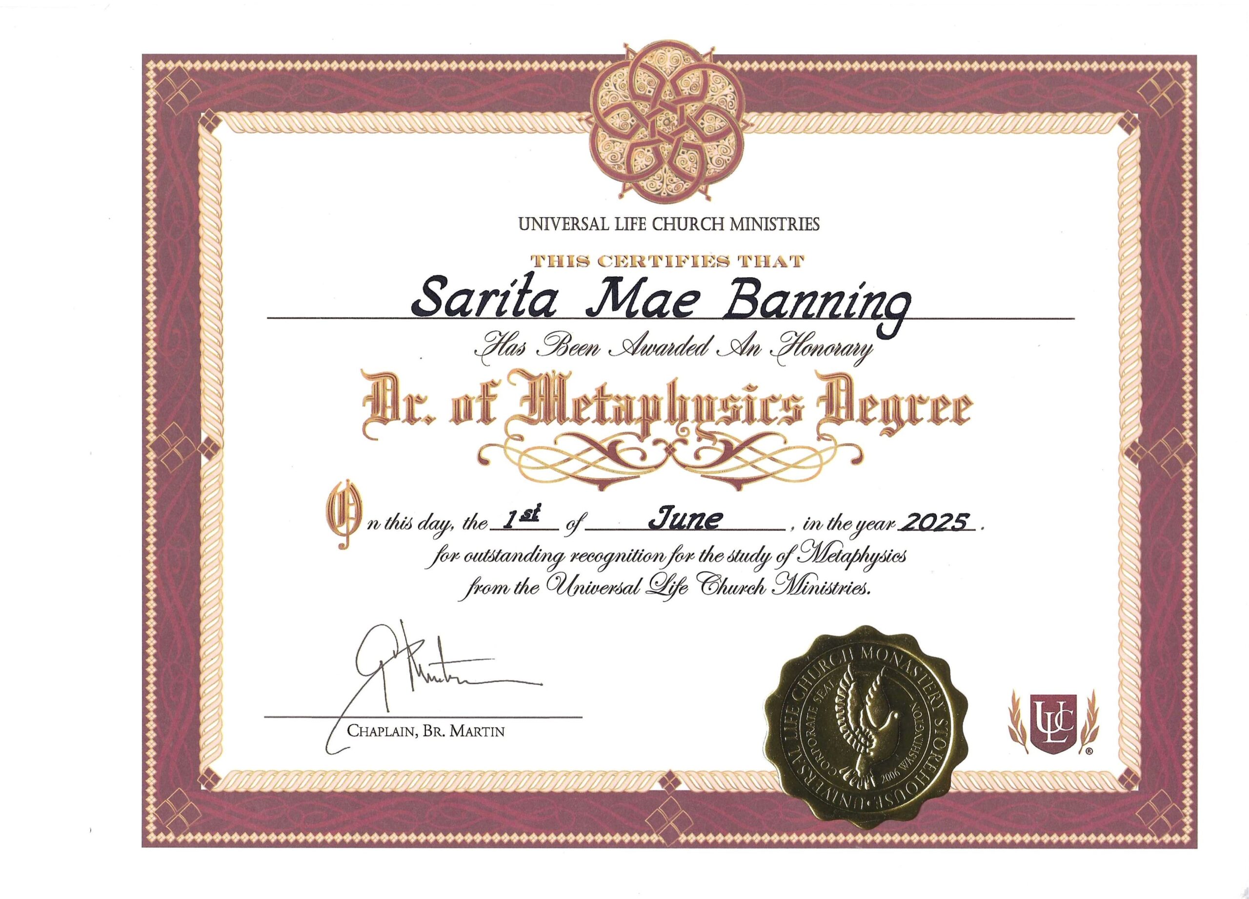 This certificate represents the sacred acknowledgment of Minister Sarita