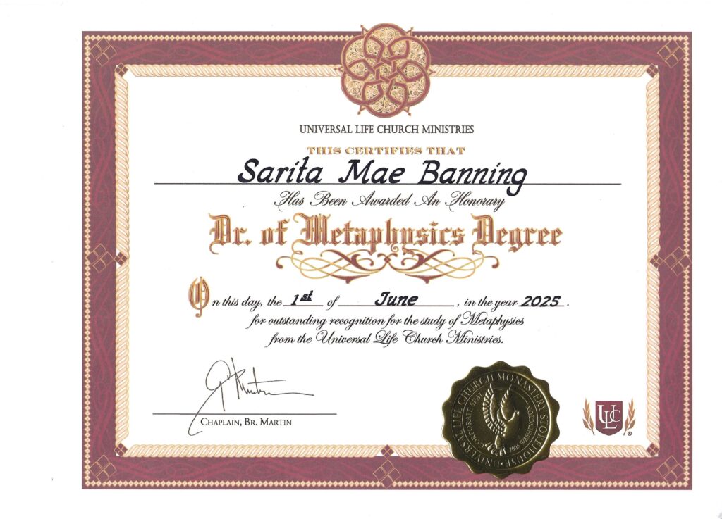 Dr. Sarita Banning is ordained through the Universal Life Church (ULC.org), a recognized spiritual institution committed to honoring every soul’s unique path. Through this accreditation, 2N21 Ministries is empowered to perform sacred ceremonies including weddings, common law marriages, baptisms, funerals, christenings, and rites of passage, blending spiritual authority with divine purpose and ancient wisdom.